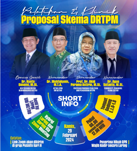 29 Februari 2024- Dosen Program Studi Pendidikan Matematika mengikuti kegiatan Workshop dan Klinik Proposal Skema DRTPM Tahun 2024 sebagai upaya meningkatkan kualitas proposal penelitian serta memperbesar peluang memperoleh pendanaan riset dari Direktorat Riset, Teknologi, dan Pengabdian kepada Masyarakat (DRTPM).