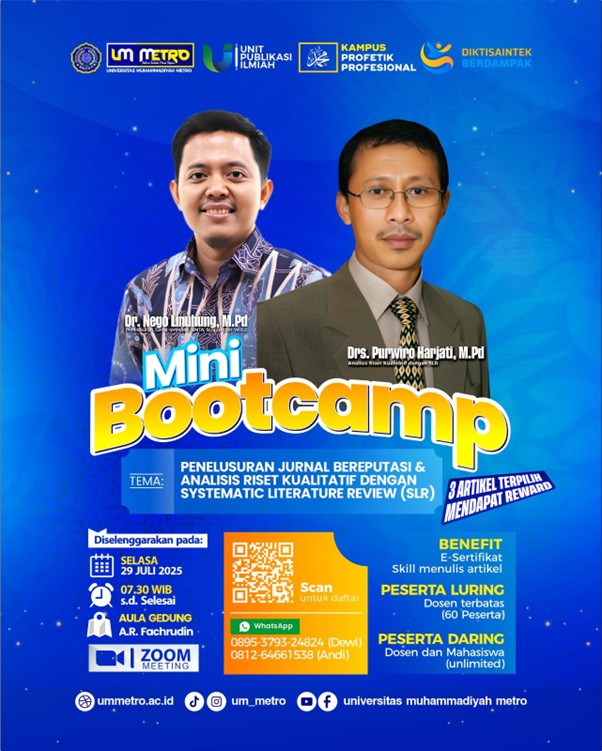Unit Publikasi Ilmiah Universitas Muhammadiyah Metro (UM Metro) menyelenggarakan kegiatan Mini Bootcamp Penelusuran Jurnal dan Analisis Riset Kualitatif Berbasis Systematic Literature Review (SLR). Kegiatan ini dirancang untuk meningkatkan kemampuan peserta dalam melakukan penelusuran jurnal ilmiah serta menganalisis riset kualitatif menggunakan pendekatan SLR, sebagai upaya strategis dalam meningkatkan mutu penulisan artikel ilmiah bagi dosen dan mahasiswa di lingkungan UM Metro.