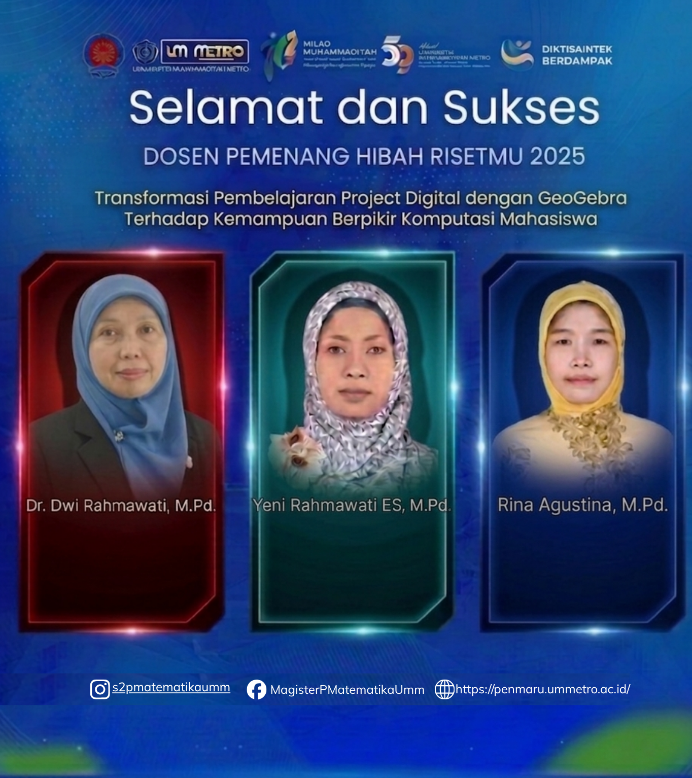 19 November 2025- Program Pascasarjana Pendidikan Matematika Universitas Muhammadiyah Metro mengucapkan selamat atas prestasi yang diraih sebagai pemenang Hibah RisetMu Tahun 2025 dengan judul penelitian Transformasi Pembelajaran Project Digital dengan GeoGebra Terhadap Kemampuan Berpikir Komputasi Mahasiswa. Program hibah ini bertujuan untuk mendukung penelitian yang berfokus pada inovasi teknologi, kesehatan, pendidikan, dan lingkungan yang dapat memberikan dampak nyata bagi masyarakat.